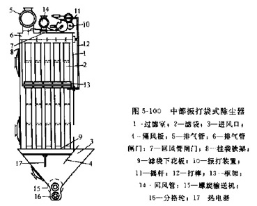 中部振打袋除塵器,又稱ZX型布袋除塵器。主要是由振打清灰裝置、濾袋、過濾室(箱體)、集塵斗、進出口風管及螺旋輔送機等部分組成,其構造如圖5—100所示。中部振打布袋除塵器是將頂部振打傳動,通過搖桿、打擊棒和框架,在除塵器中部搖晃濾袋而達到清灰的目的。其特點是;具穩定的較高除塵率和較低的阻力;構造簡單,濾袋裝卸方便,維護容易。