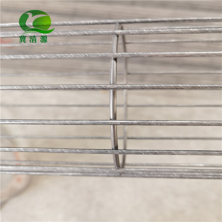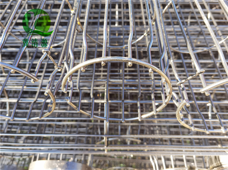 籠骨采用圓型結(jié)構(gòu),袋籠的縱筋和反撐環(huán)分布均勻,并有足夠的強(qiáng)度和剛度,防止損壞和變形(縱筋直徑≥φ4,加強(qiáng)反撐環(huán)φ5、間距200,),籠骨長度充分考慮到濾袋的熱收縮性,頂部加裝“η”形冷沖壓短管,用于保正袋籠的垂直及保護(hù)濾袋口在噴吹時(shí)的安全。