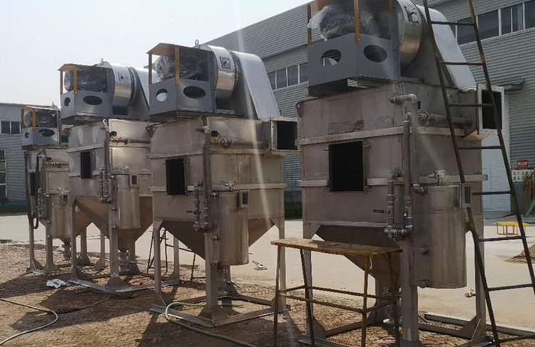 A-沖激式除塵器,氣流轉彎向下沖擊于水面,部分較大的塵粒落入水中。當含塵氣體以18—35米/秒的速度通過上下葉片間的“S”形通道時,激起大量的水花,使水氣接充分接觸,絕大部分微細的塵粒混入水中,使含塵氣體得以充分凈化。經由“S”形通道后,由于離心力的作用,獲得塵粒的水又返回漏斗。凈化后的氣體由分霧室擋水板除掉水滴后經氣出口和通風機排出除塵機組。混漿由則漏斗的排漿閥連續或定期的排出,新水則由供水管路補充。