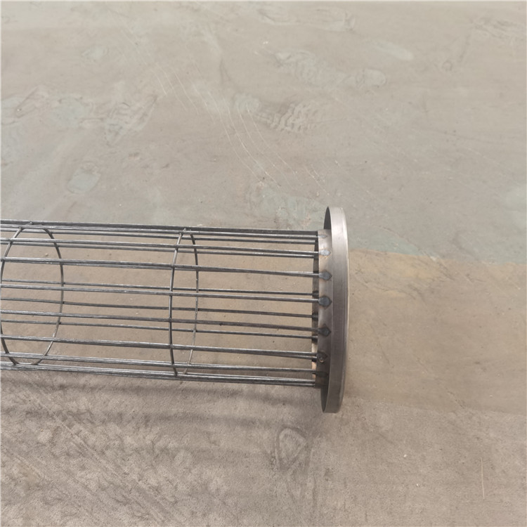 袋籠采用圓型結(jié)構(gòu),袋籠的縱筋和反撐環(huán)分布均勻,并有足夠的強(qiáng)度和剛度,防止損壞和變形(縱筋直徑≥Φ4,加強(qiáng)反撐環(huán)Φ5、間距200,),頂部加裝“η”形冷沖壓短管,用于保正袋籠的垂直及保護(hù)濾袋口在噴吹時(shí)的安全。