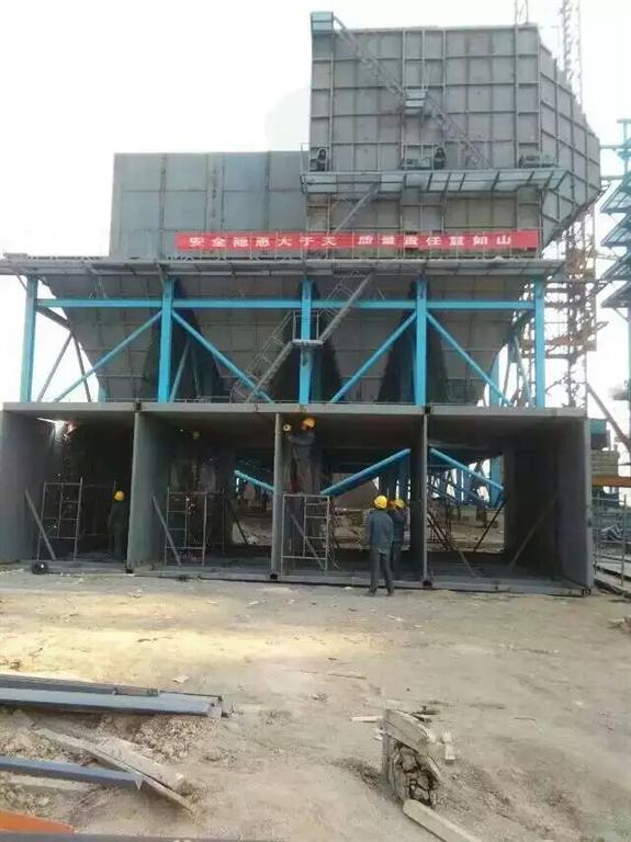 鍋爐布袋除塵器的氣體凈化方式為外濾式,含塵氣體由導(dǎo)流管進(jìn)入各單元過(guò)濾室并通過(guò)進(jìn)風(fēng)閥進(jìn)入設(shè)置于除塵器灰斗上側(cè)的煙氣導(dǎo)流裝置;氣流通過(guò)阻流加導(dǎo)流型氣流分布裝置的適當(dāng)導(dǎo)流和自然流向分布,從下部均勻進(jìn)入袋室,整個(gè)過(guò)濾室內(nèi)氣流分布均勻;含塵氣體中的顆粒粉塵在進(jìn)風(fēng)道內(nèi)通過(guò)自然沉降分離后直接落入灰斗,其余粉塵在煙氣導(dǎo)流裝置的引導(dǎo)下,隨氣流進(jìn)入中箱體過(guò)濾區(qū),吸附在濾袋外表面。鍋爐布袋除塵器過(guò)濾后的潔凈氣體透過(guò)濾袋經(jīng)上箱、排風(fēng)管排出。因采用下部進(jìn)風(fēng)的方式,濾袋底部與進(jìn)風(fēng)口留有相當(dāng)?shù)母叨龋业臍饬魃仙俣群艿停径沤^了二次揚(yáng)塵的產(chǎn)生。