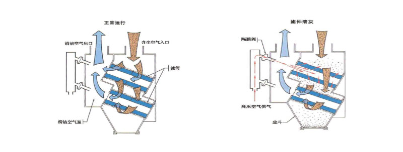 含塵氣體在風機的引導下進入除塵器后,由于氣流端面的突然擴大及氣流分布板的作用,氣流中一部分顆粒粗大的塵粒在重力和慣性力的作用下,沉降到灰斗;粒度細、密度小的塵粒進入過濾室,通過布朗擴散和纖維攔截等綜合效應,使粉塵沉積在濾筒的濾料表面,凈化后的氣體進入凈氣室內,由出風口經風機排出。