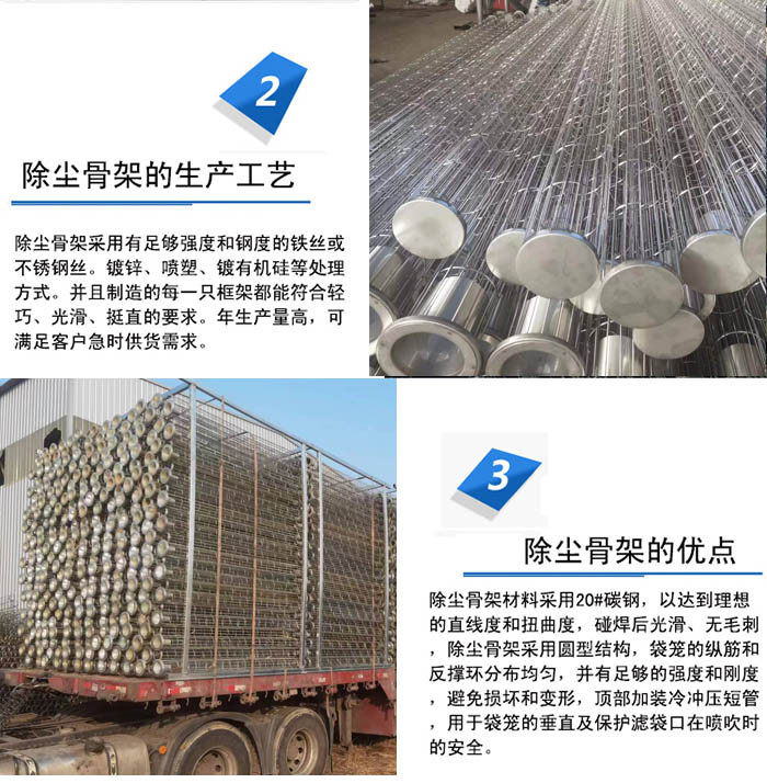 除塵骨架要求支撐環(huán)和縱筋分布均勻,并應(yīng)有足夠的強(qiáng)度和剛度,能承受濾袋在過濾及清灰狀態(tài)中的氣體壓力,能防止在正常運輸和安裝過程中發(fā)生的碰撞和沖擊所造成的損壞和變形.