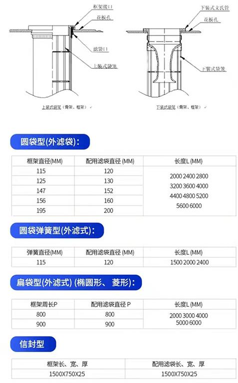 1. 圓袋型(外濾袋) 2. 圓袋彈簧型(外濾式) 3. 扁袋型(外濾式)(橢圓形、菱形) 4. 信封型 5. 多節(jié)式框架(橢圓型多節(jié)框架. 圓袋型多節(jié)框架(插節(jié)式、卡盤式)) 6. 成品框架(帶文氏管的框架. 塑料袋、鐵架包裝的框架. 排列整齊的菱形框架)